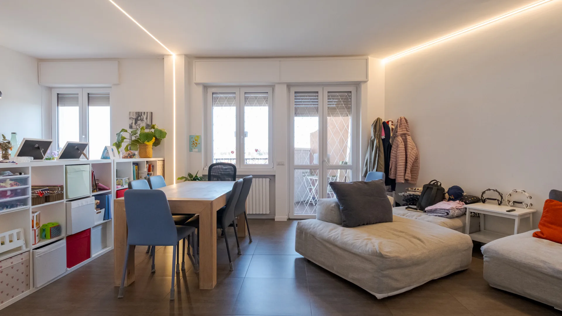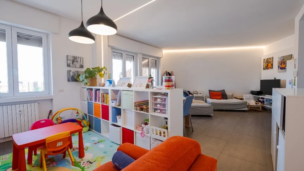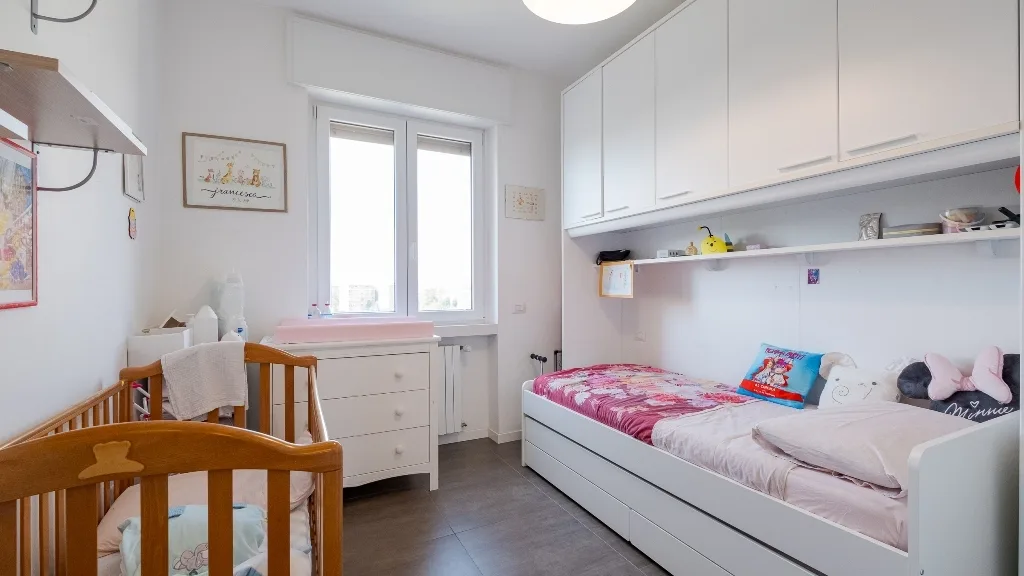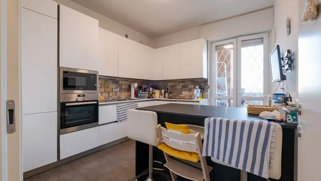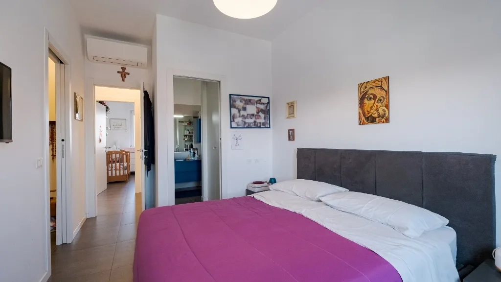 Ampia zona living con balcone, disimpegno, cucina abitabile con balcone, camera matrimoniale dotata di cabina armadio e bagno en-suite, cameretta e secondo bagno.