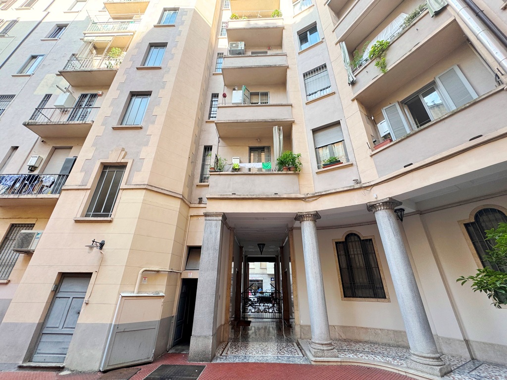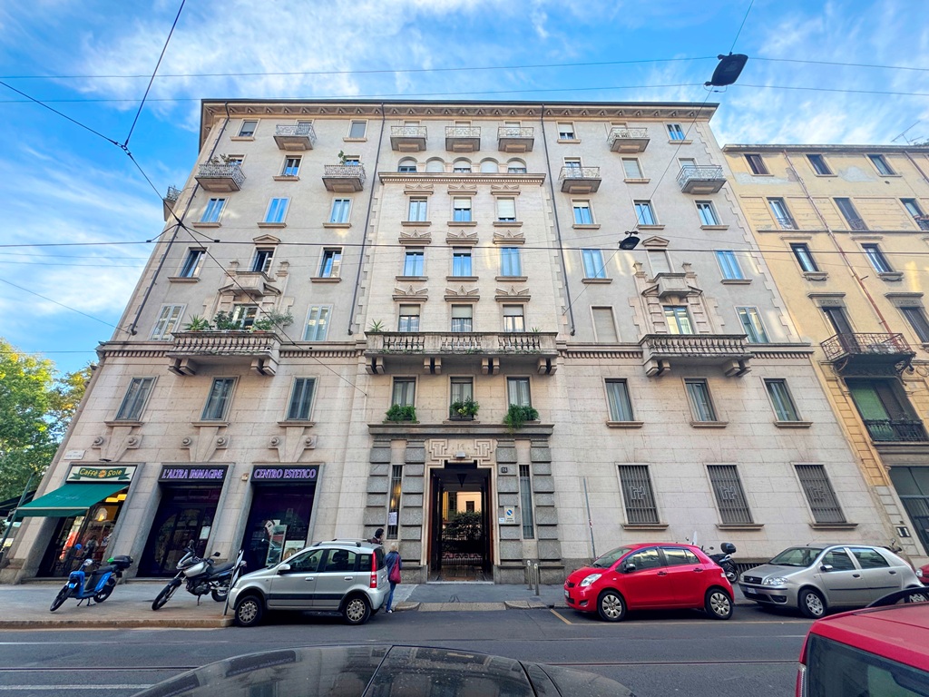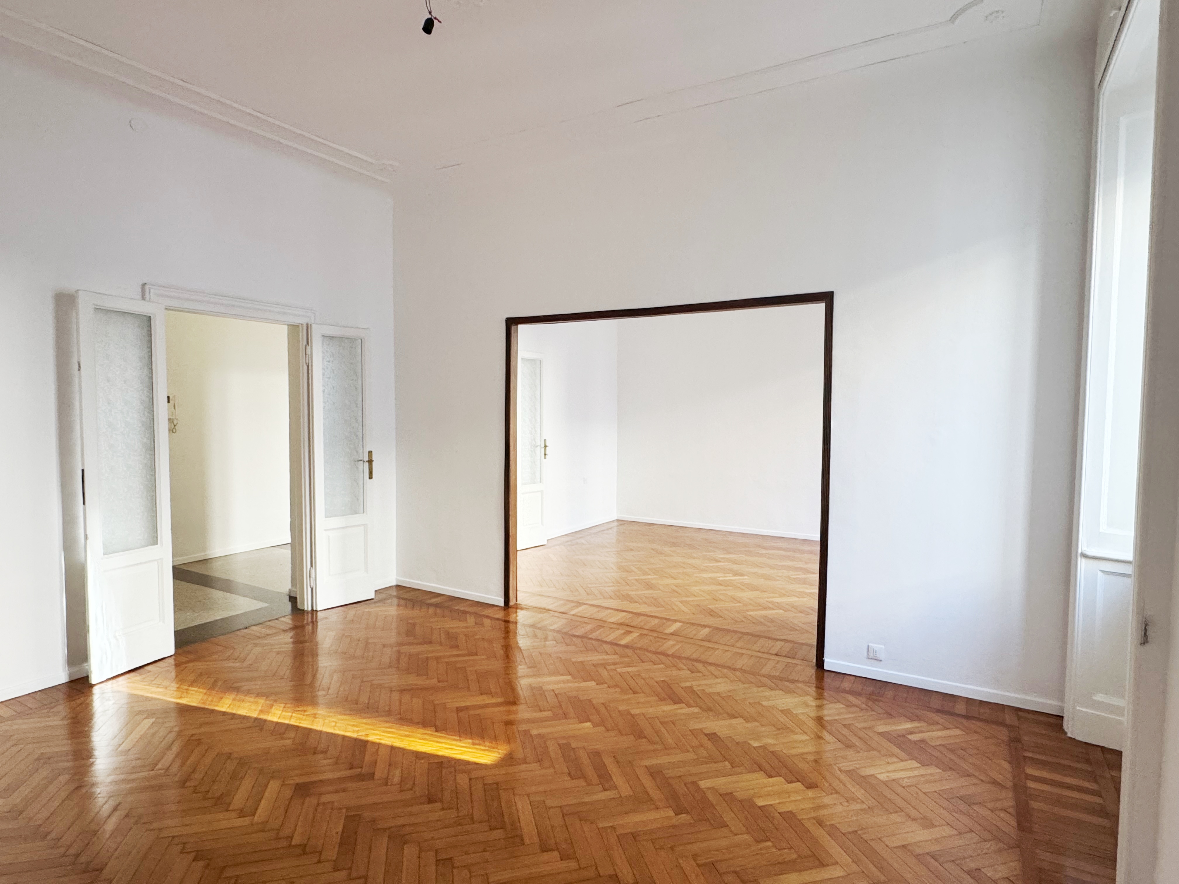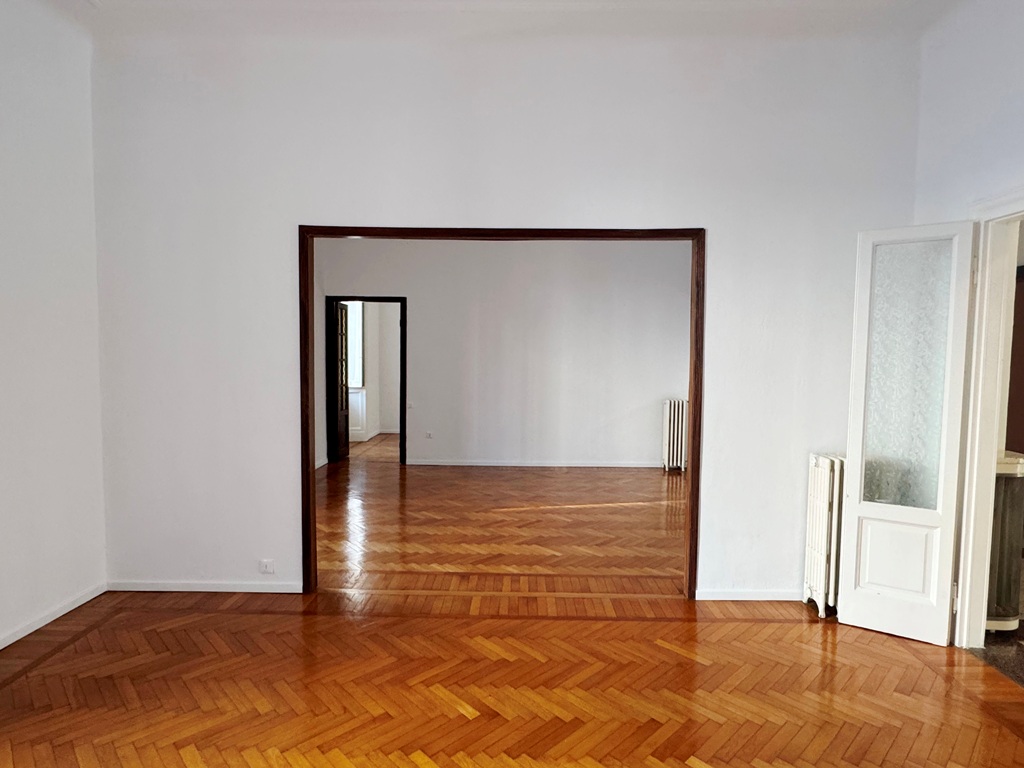 Ingresso, ampio disimpegno, soggiorno doppio con affaccio su viale Coni Zugna, cucina abitabile con balcone, tre camere e doppi servizi.